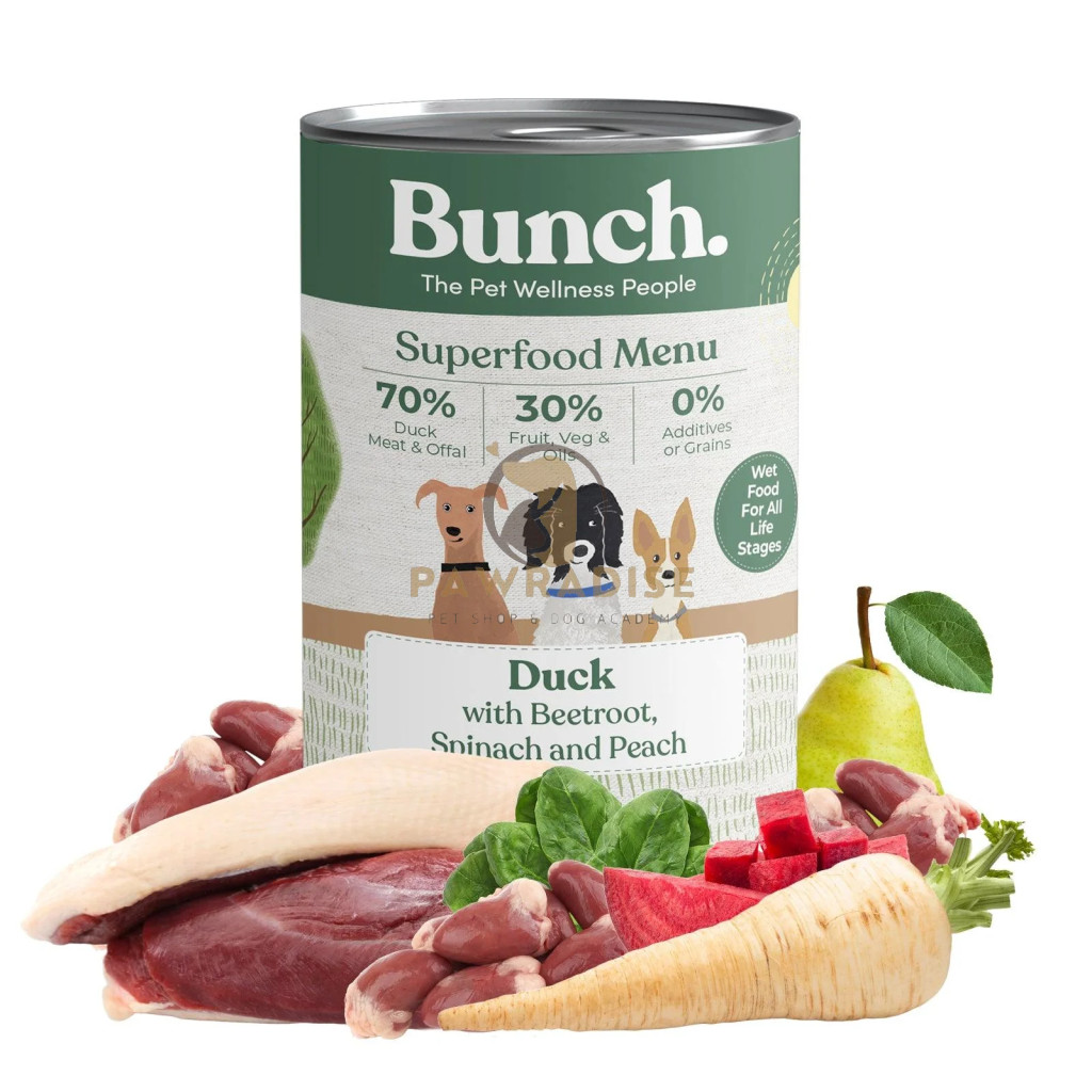 42% kacsahús, 16% kacsaszív, 12% kacsamellcsont, 5% petrezselyemgyökér, 5% cékla, 5% spenót, 5% körte, 5% alma, 1,5% őszibarack, 1,5% repceolaj, 0,9% csipkebogyó, 0,6% algamész, 0,3% szezám, 0,2% tengeri alga por