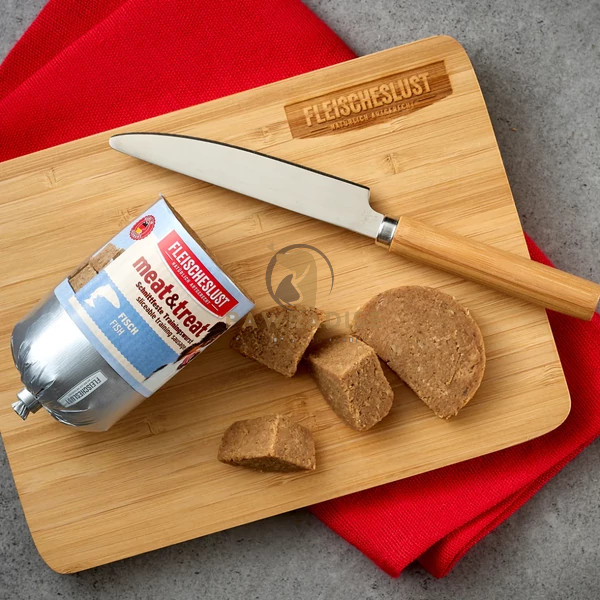 Összetétel: 65% hal ( 45% tőkehal, 20% lazac), 10% burgonyakeményítő, 7% répapép, 5% durumbúzadara