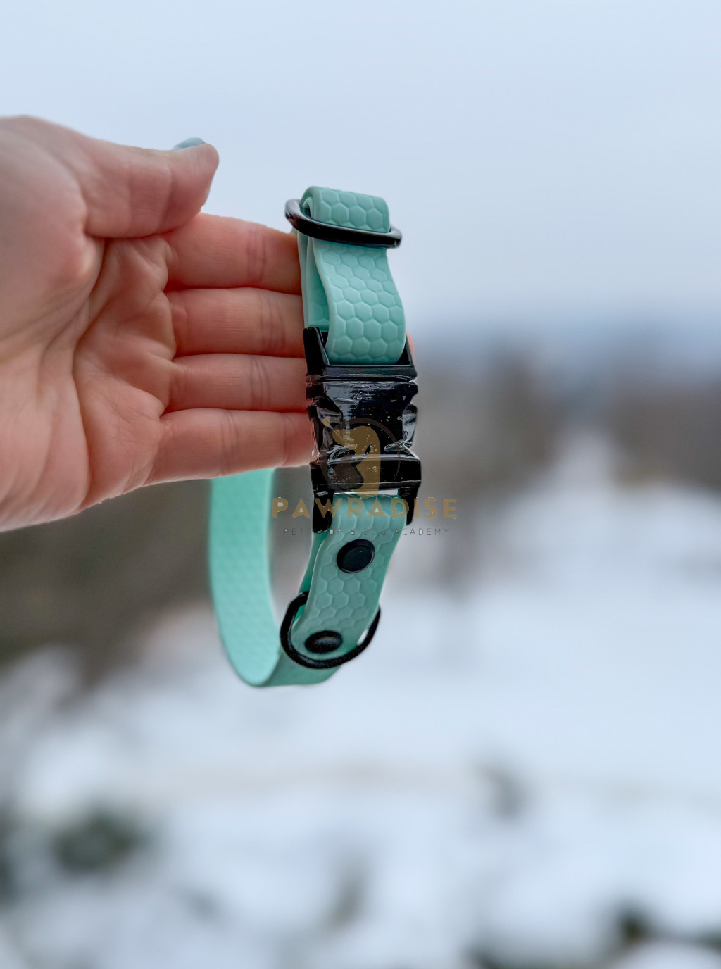 Erőteljes kontrasztot adnak a menta alaphoz, sportos és határozott összhatást kölcsönözve a nyakörvnek.