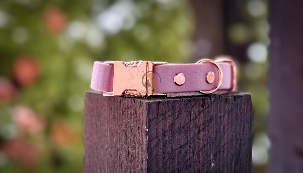 Ez a nyakörv a karakteres stílus és a praktikus funkcionalitás tökéletes kombinációja. Kézzel készült prémium darab, amely finom levendula árnyalatával és elegáns rose gold kiegészítőivel stílusos, modern megjelenést biztosít. Strapabíró kialakítása miatt ideális a mindennapi használathoz, legyen szó sétáról vagy tréningről.