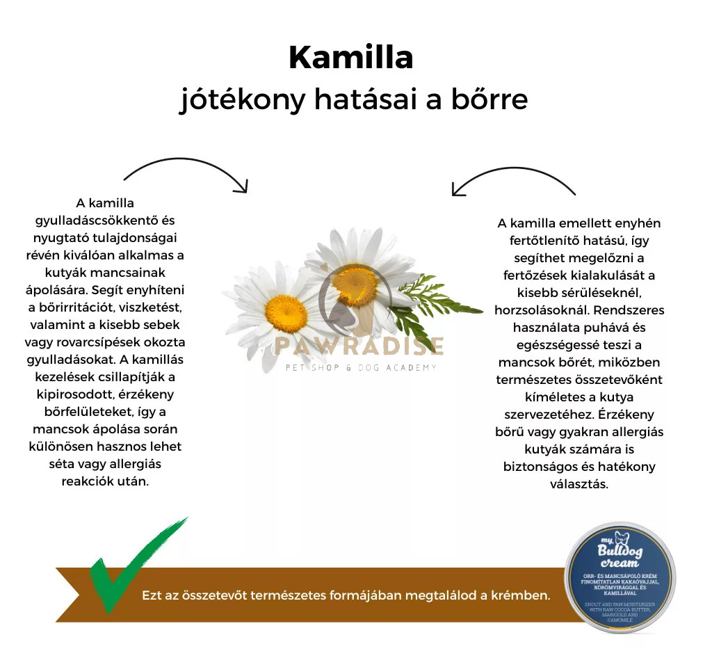 Tradicionálisan használt gyógynövény bőrnyugtatásra és hámosításra. Gyulladáscsökkentő hatása miatt különösen jó választás érzékeny, sérült vagy irritált bőrre – tökéletes mancsokra és orra egyaránt.