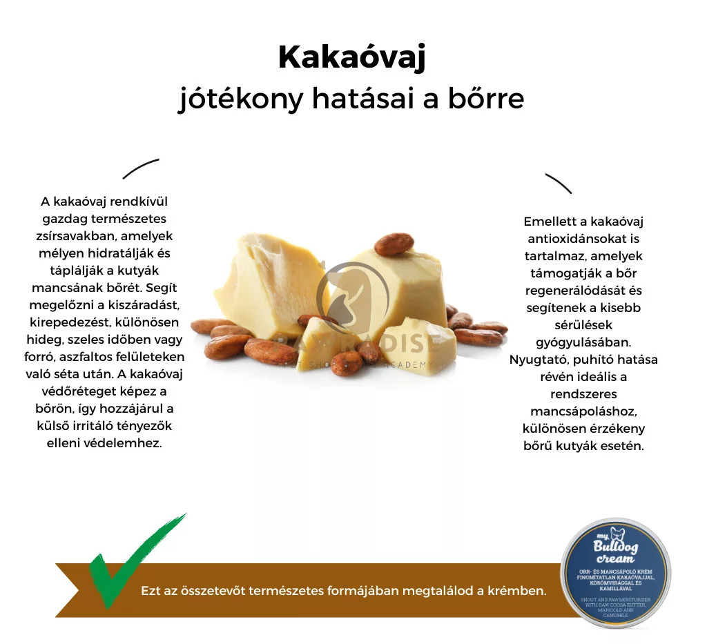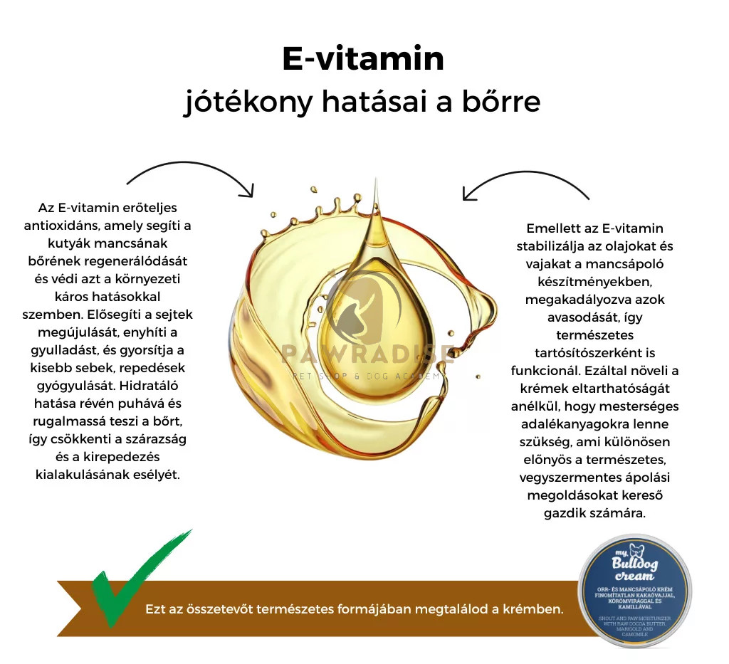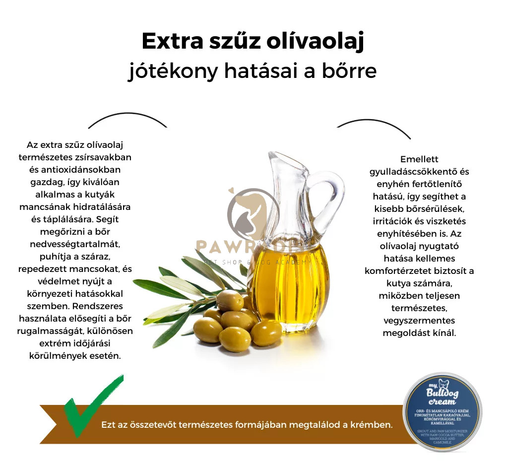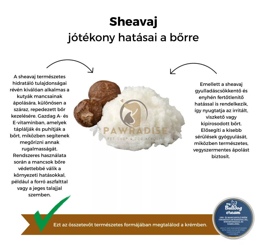 Bőrpuhító, gyulladáscsökkentő hatása miatt szinte kihagyhatatlan. Regenerálja, nyugtatja és hidratálja a kiszáradt tappancsokat és orrocskákat.